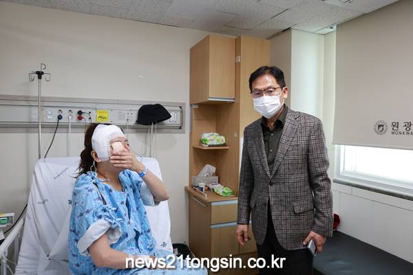 지난 11일 김철문 전북경찰청장은 원광대학교병원(병원장 서일영)을 방문하여 근무 중 뇌출혈로 긴급 수술을 받은 A경위를 위로하고 가족과 함께 조속한 회복을 기원했다.