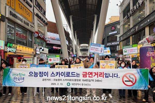 대전 중구(청장 김제선)는 지역의 대표 명소인 으능정이 스카이로드 구간을 쾌적하고 담배 연기 없는 거리 환경으로 조성하기 위해 이번 달 13일부터 금연거리로 지정하고 홍보 캠페인을 펼쳤다고 밝혔다.