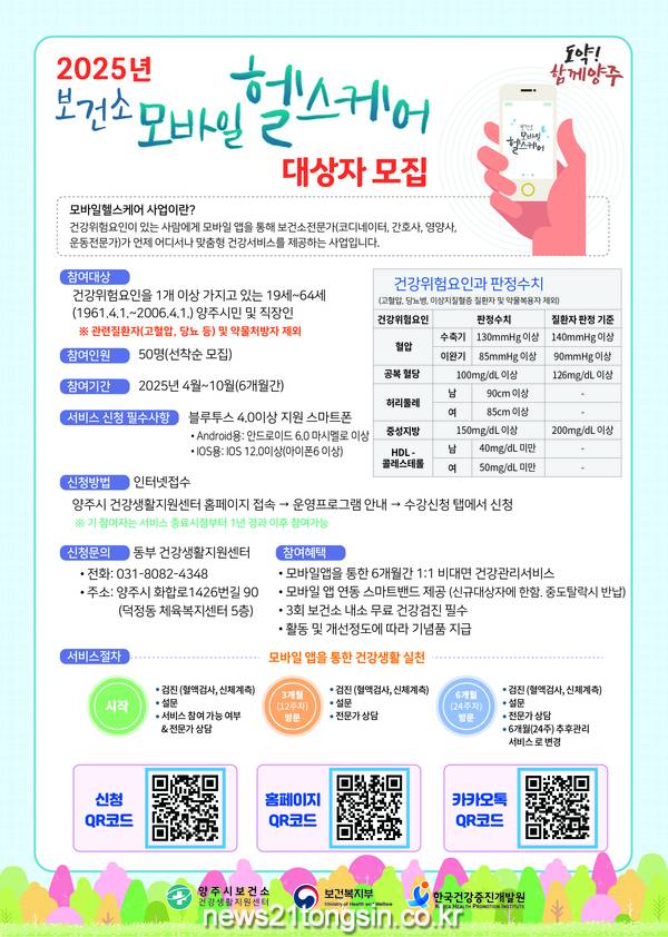 사업 신청은 양주시 건강생활지원센터 누리집에서 신청할 수 있으며 기타 자세한 사항은 양주시 동부건강생활지원센터(☎031-8082-4345, 4349)로 문의하면 된다.