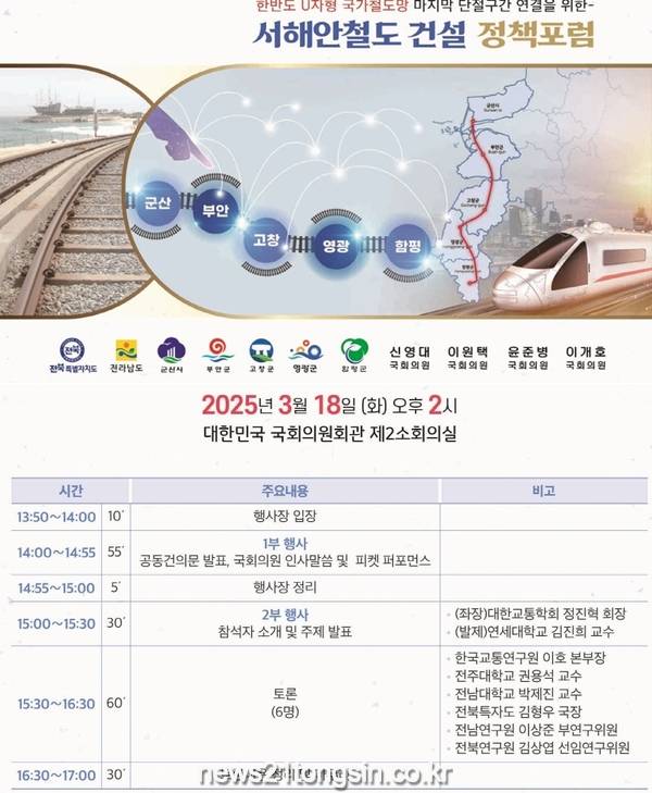 [뉴스21통신전북취재팀] 전북특별자치도 고창군은 서해안철도 건설의 필요성과 당위성을 논의하는 ‘서해안철도 건설 정책포럼’이 오는 3월18일 오후 2시 국회의원회관 제1소회의실에서 열린다고 14일 밝혔다.