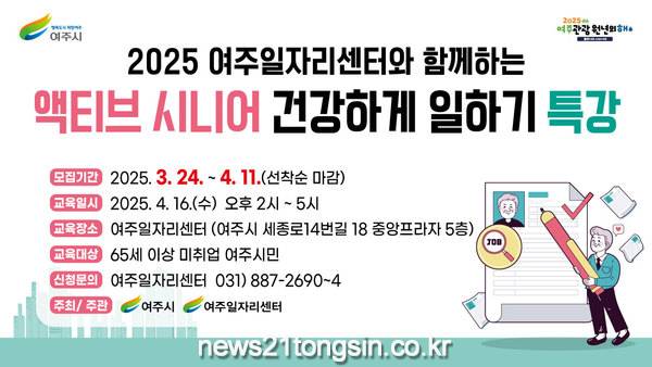 여주시(시장 이충우)는 오는 24일부터 여주일자리센터에서 ‘2025 액티브 시니어 건강하게 일하기’ 특강 교육생을 모집한다고 밝혔다.