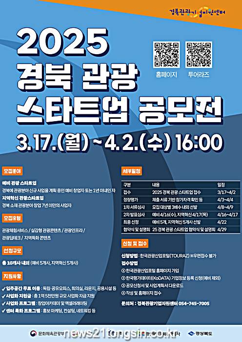 경상북도 관광산업 활성화를 위해 구축된 경북관광기업지원센터가 경상북도 관광 분야 창업 활성화와 유망 관광기업 집중 육성을 위해 ‘2025 경북 관광 스타트업 공모전’을 개최한다.