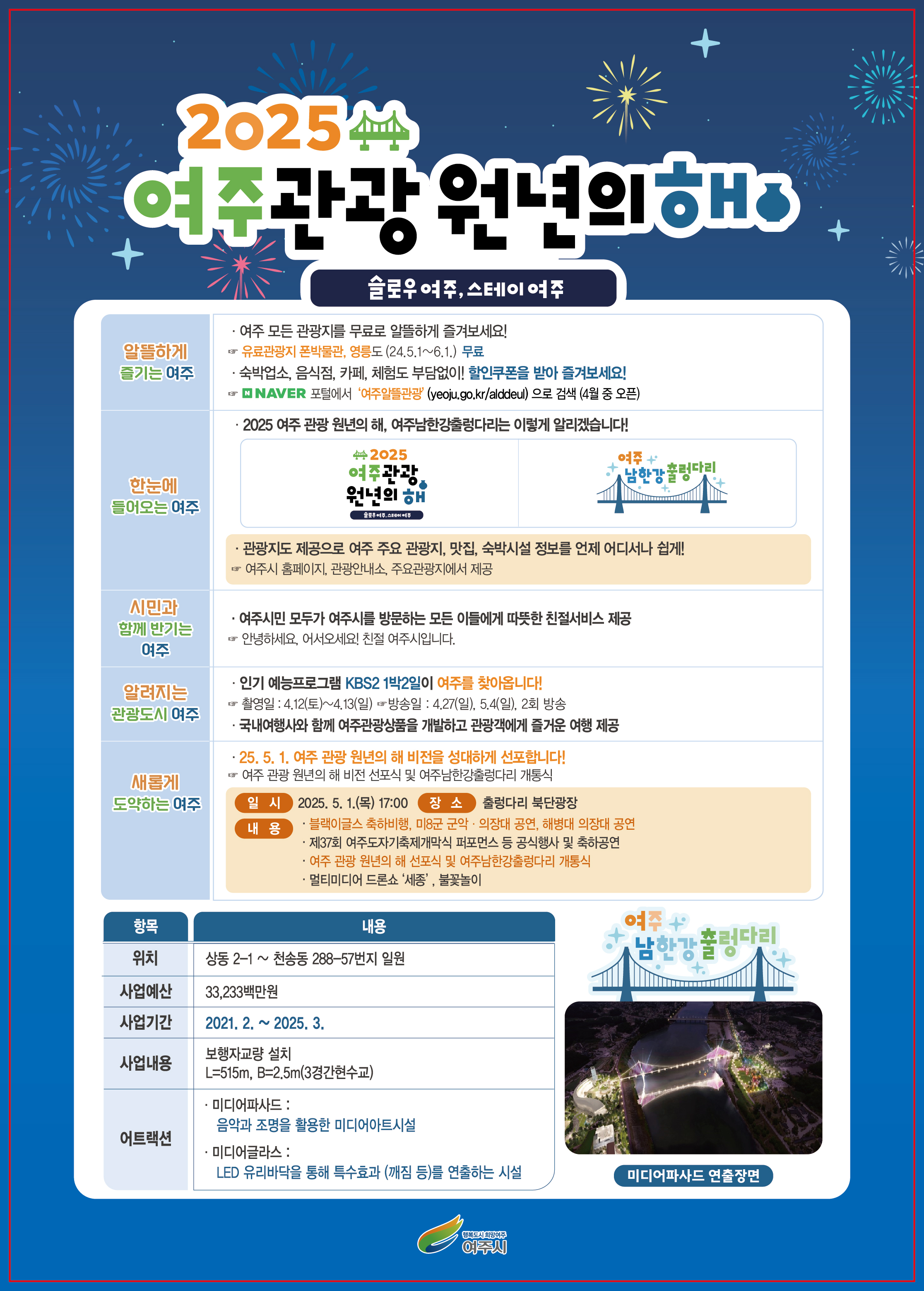 마지막으로 ‘새롭게 도약하는 여주’를 통해 5월 1일 여주 관광 원년의 해 비전과 여주남한강출렁다리의 개통을 성대하고 화려하게 알린다.