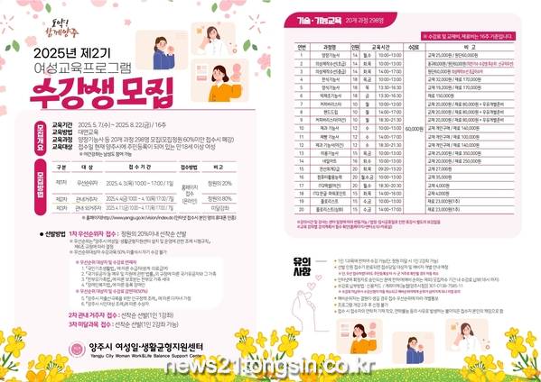 ▲ 사진=양주시양주시가 오는 4월 3일부터 17일까지 ‘여성일․생활균형지원센터’에서 ‘2025년 제2기 여성교육프로그램’의 수강생을 선착순 모집한다고 밝혔다.