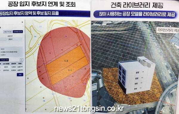 지형·건축 시뮬레이션에선 산지전용허가 여부 확인을 위한 평균 경사도 계산, 절·성토 등 토공량 산정 및 평탄화 등 지형 생성, 가상 건축물 생성 기능을 통해 건축할 수 있는 공장 외형을 미리 확인해 볼 수 있다.