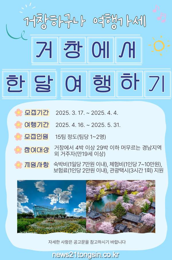 거창군은 오는 4월 4일까지 ‘거창에서 한 달 여행하기’ 사업 참가자 15팀을 모집한다고 19일 밝혔다. 여행 기간은 4월 16일부터 5월 31일까지이다. 참가자들은 기간 내 4박에서 29박 이내로 거창에 머물며 관광 자원을 체험하고 사회관계망서비스(SNS)를 통해 홍보하면 된다.