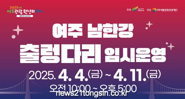 여주세종문화관광재단(이사장 이순열)은 오는 4월 4일부터 11일까지 여주 남한강 출렁다리를 임시 운영한다고 밝혔다.