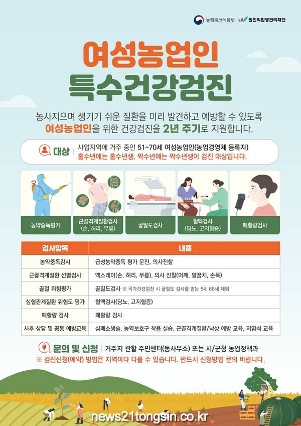 연천군 관계자는 “여성농업인의 농작업 질환 예방(조기발견)으로 건강복지 증진에 도움이 되길 바란다”고 말했다.