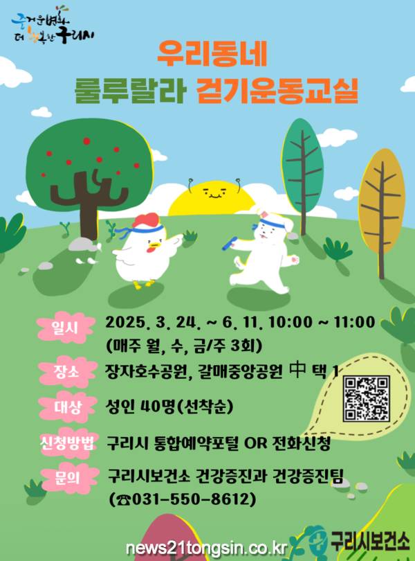 ▲ 사진=구리시구리시(시장 백경현)는 걷기에 관심 있는 시민들을 위해 오는 3월 24일부터 6월 11일까지 우리동네 룰루랄라 걷기 운동교실을 운영한다고 밝혔다. 운동교실은 장자호수공원과 갈매중앙공원 2개소에서 평일월, 수, 금 오전 10시부터 11시까지 진행되며, 총 33회 수업으로 구성된다.