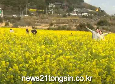 ▲ 사진=kbs뉴스 영상 캡쳐푸른 하늘과 바다가 맞닿은 산방산 아래, 노란 유채꽃 물결이 일렁인다.