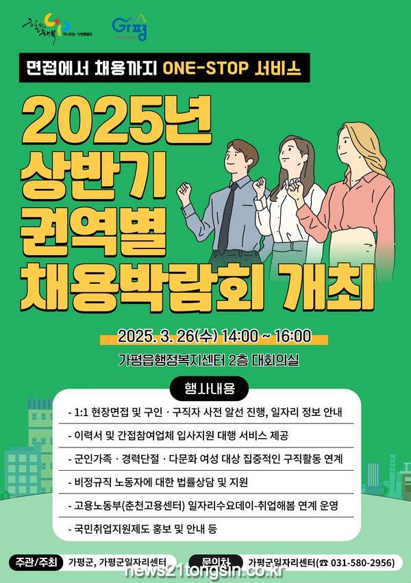 ▲ 사진=가평군가평군(군수 서태원)이 구직자와 기업을 직접 연결하는 ‘2025년 상반기 1차 권역별 채용박람회’를 오는 3월 26일 오후 2시부터 4시까지 가평읍행정복지센터 대회의실에서 개최한다.