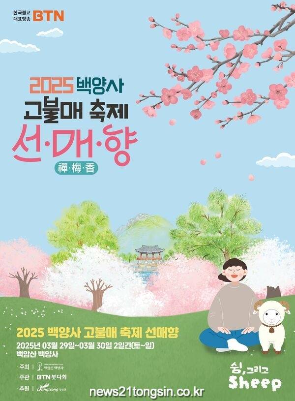 대한불교조계종 제18교구본사 백암산 백양사 주최, 비티엔(BTN) 붓다회 주관, 장성군 후원으로 열리는 이번 축제는 천연기념물 제486호 고불매를 주제로 한 행사다. 전통문화와 명상을 결합한 콘텐츠를 선보여 방문객들에게 치유와 정서적 안정을 선사할 예정이다.