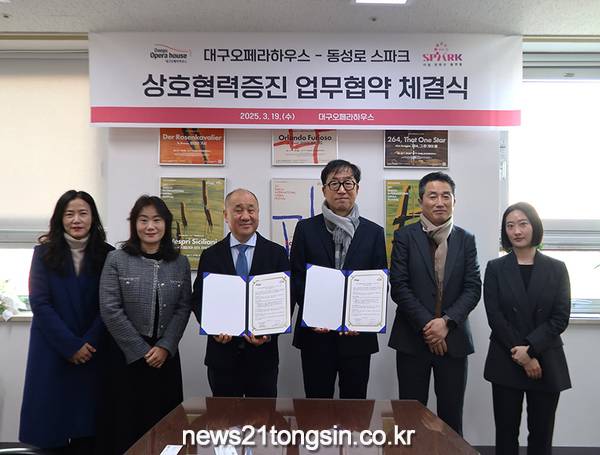 □ 대구를 대표하는 랜드마크 ‘대구오페라하우스와 동성로 스파크’는 3월 19일(수)에 정갑균 대구오페라하우스 관장, 이동경 동성로 스파크 대표 및 양 기관 관계자들이 참석한 가운데, 상호 협력과 교류를 바탕으로 지역 문화예술 진흥을 도모하고, 지역민을 위한 문화예술 향유 기회 확대 등 다각적 측면으로 접근한 업무 협력을 추진하고자 업무협약을 체결했다.