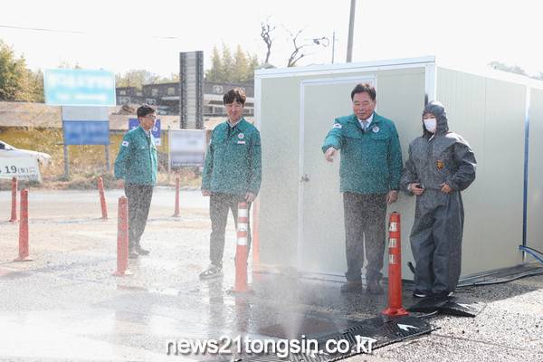 김산 무안군수는 21일 무안군 전역에 설치된 방역 통제초소 5곳(일로 3, 몽탄 1, 청계 1)을 방문해 현장 근무자들의 노고를 격려하고, 차량 소독과 장비 작동 상태를 꼼꼼히 살펴보며 방역 상황을 재차 확인했다.