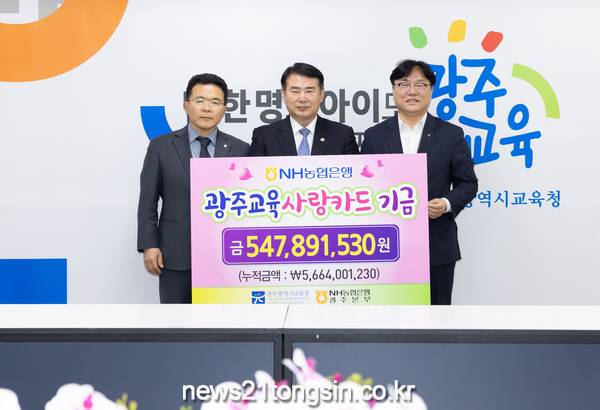 광주시교육청(교육감 이정선)은 24일 본청 상황실에서 NH농협은행으로부터 지난해 광주교육사랑카드 적립금 5억4천789만 원을 전달받았다.