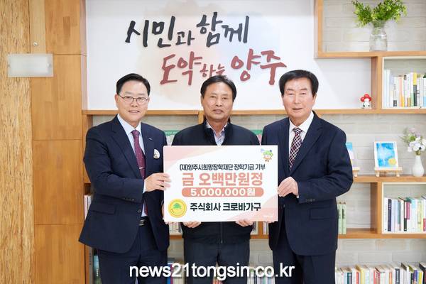 ▲ 사진=가평군양주시는 ㈜크로바가구(대표 권양섭)가 지난 21일 양주시청에서 열린 장학기금 기부식에서 지역 인재 양성과 교육 발전을 위해 500만 원을 기부했다고 밝혔다.
