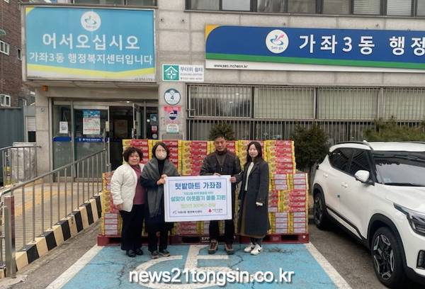 가좌3동 텃밭마트(대표 노형균)는 민족 대명절 설날을 맞아 지난 1월 16일(목) 가좌3동 행정복지센터(동장 김성주)를 방문하여 설맞이 사랑의 이웃돕기 물품(컵라면 300박스)을 전달했다.