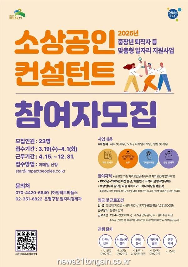 은평구(구청장 김미경)는 ‘중장년 새출발 퇴직자 등 맞춤형 일자리 지원사업’에 참여할 소상공인 컨설턴트 참여자를 내달 1일까지 모집한다고 밝혔다.