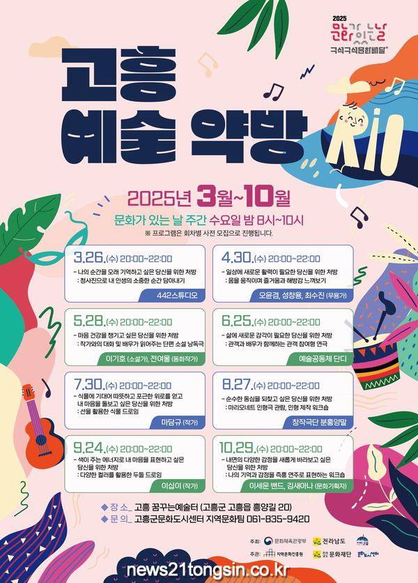 고흥군(군수 공영민)이 지역 간 문화격차 해소를 위해 문화체육관광부에서 주최하고 지역문화진흥원이 주관하는‘2025 문화가 있는 날 구석구석 문화배달’ 공모사업에 2년 연속 선정돼 군민을 위한 다양한 문화행사를 개최한다고 밝혔다.
