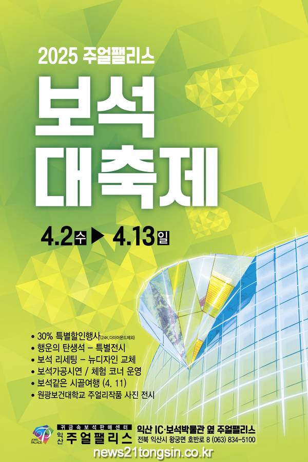 익산시는 4월 2일부터 13일까지 왕궁면에 있는 주얼팰리스와 보석테마관광지 일원에서 '2025 주얼팰리스 보석대축제'가 열린다고 24일 밝혔다.