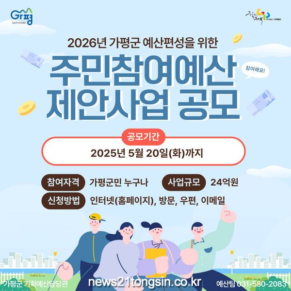 ▲ 사진=가평군가평군(군수 서태원)이 주민이 직접 제안한 사업을 2026년도 예산에 반영하는 ‘주민참여예산 제안사업 공모’를 진행한다. 접수는 5월 20일까지이다.