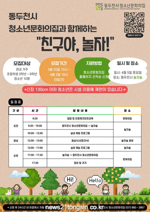 ▲ 사진=동두천시동두천시 청소년문화의집은 오는 4월 5일 관내 청소년들을 위해 동두천시에 있는 놀자숲 테마파크에서 특별한 체험 프로그램을 운영한다고 밝혔다.