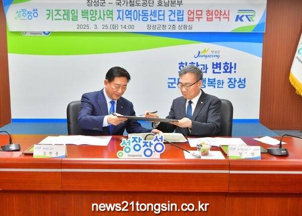 군은 25일 군청 상황실에서 국가철도공단 호남본부와 ‘키즈레일 지역아동센터 건립 업무협약’을 맺고, 지역아동센터 건립‧운영 전반에 관해 상호 협력하기로 했다. 협약식에는 김한종 장성군수, 정기연 호남본부장 등 관계자 다수가 참석했다.