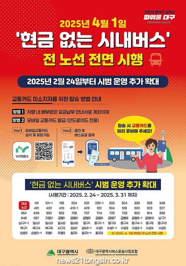 이에, 4월 1일(화)부터 대구시 전체 시내버스 127개 노선, 1,566대를 대상으로 ‘현금 없는 시내버스’를 전면 시행함으로써, 비용 절감 및 운행시간 단축 등 운영 효율성을 제고한다.