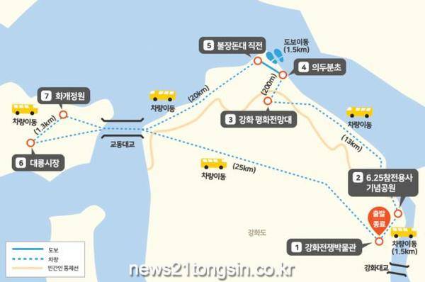 강화 테마노선은 강화전쟁박물관, 6.25 참전용사기념공원, 강화평화전망대, 의두분초, 대룡시장, 화개정원을 둘러보는 코스로 구성돼 있다. 철책선을 따라 걷는 약 1.5㎞ 구간을 포함해 전체 이동 거리는 62.5㎞이며, 소요 시간은 약 5~6시간이다. 참가자들은 이동 중 해설사의 안내를 통해 다양한 역사적 이야기와 의미를 들을 수 있다.
