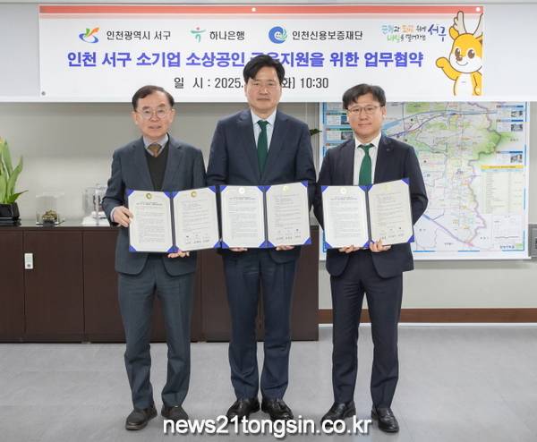 인천 서구(구청장 강범석)는 지난 18일 하나은행·인천신용보증재단과 함께 45억원 규모의 「소기업·소상공인을 위한 금융지원 업무 협약」을 체결했다고 19일 밝혔다.