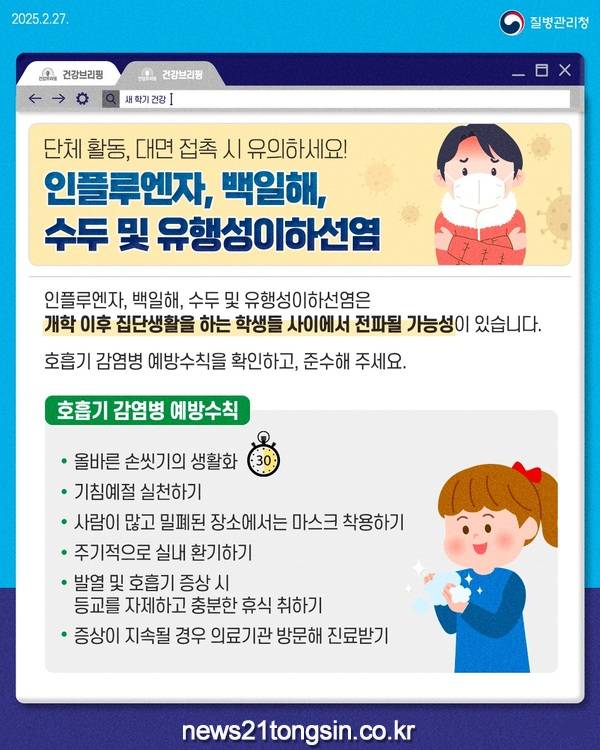 호흡기 감염병은 연례적으로 학기 중 발생이 증가했다가 방학 기간 감소하는 특성을 보이므로 신학기 실내 공동생활을 하는 학령기 소아와 청소년 감염 예방에 주의가 필요하다.