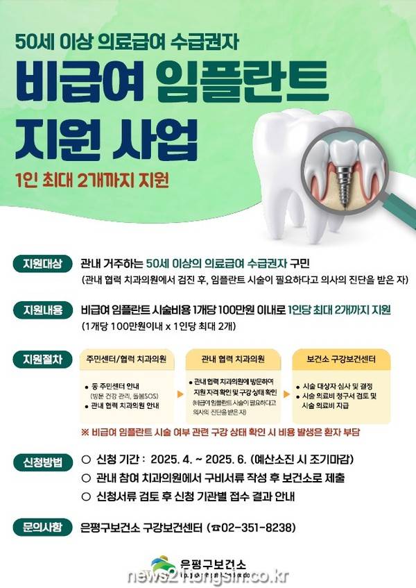 지원 대상은 주민등록상 은평구에 주소를 두고 거주 중인 50세 이상의 의료급여 수급권자로 임플란트 시술이 필요하다고 진단을 받은 자이다. 신청한 순서로 선정되고, 대상자로 결정되면 관내 협력 치과의원에서 임플란트 시술을 받을 수 있다.