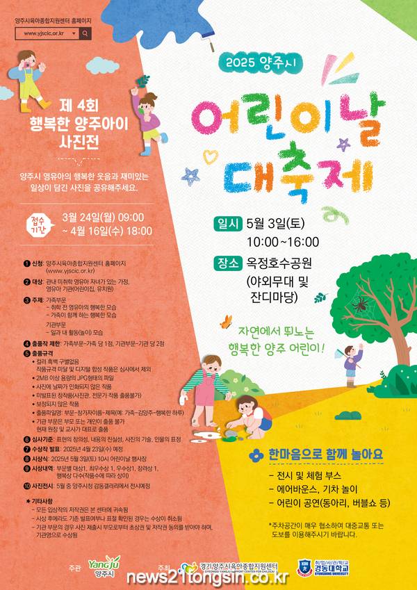 참가를 원하는 이들은 양주시육아종합지원센터 누리집에서 공모 부문을 확인한 후 JPG 형식(2MB 이상)의 파일로 규격에 맞춰 제출하면 된다.