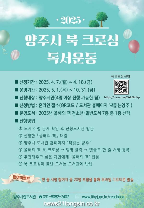 참여를 희망하는 시민은 온라인으로 신청한 뒤, 도서관을 방문해 선정 도서를 대출받아야 한다. 이후 도서관 홈페이지 내 ‘책읽는양주’ 코너에서 ‘올해의 책 북 크로싱’ 팀명을 클릭하고, 한 줄 서평을 댓글로 남기면 된다. 책을 읽은 뒤에는 추천하고 싶은 지인에게 책을 전달하며 북 크로싱을 이어가고, 운동이 끝나면 가까운 도서관에 책을 반납하면 된다.