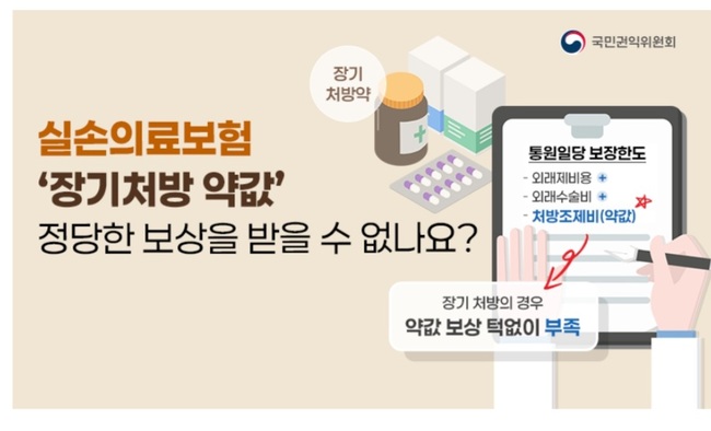 이에 국민권익위원회는 실손의료보험의 장기 처방 약값(처방조제비)에 대한 정당한 실비보상을 받을 수 있는 방안을 마련하고 있다.