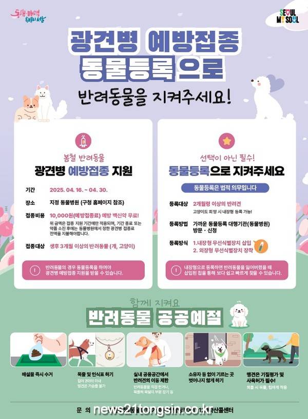 은평구(구청장 김미경)는 오는 16일부터 30일까지 관내 지정 동물병원 39곳에서 '봄철 광견병 예방접종'을 실시한다고 밝혔다.