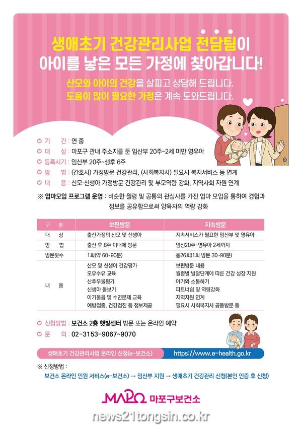 ‘생애초기 건강관리사업’의 대상자는 마포구 관내 주소지를 둔 임신 20주 이상 임산부와 2세 미만 영유아가 있는 출산가정이다.
