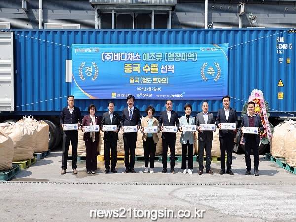 장흥군은 2일 어업 회사법인 바다 채소(주) 사업장에서 염장 미역 중국 수출을 위한 선적식을 가졌다고 전했다.