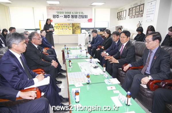 이틀 일정으로 제주를 방문한 강기정 시장은 첫날인 2일 제주4·3평화기념관 유족회 사무실에서 ‘한강이 이어준 4·3과 5·18 광주↔제주 동행 간담회’를 열어 ‘평화연대 방안’을 논의했다.