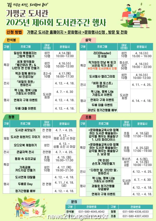 ▲ 사진=가평군가평군도서관은 제61회 도서관 주간(4월 12~18일)을 맞아 ‘꿈을 키우는 씨앗, 도서관에 묻다’라는 주제로 다양한 독서문화 행사를 운영한다고 밝혔다.