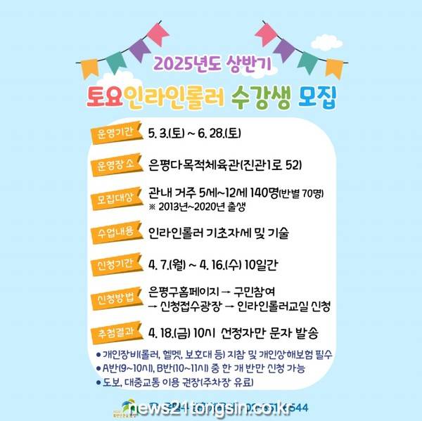 은평구(구청장 김미경)는 관내 어린이를 대상으로 생활체육능력 향상을 위한 ‘상반기 토요 인라인롤러 교실’을 운영하고 참여자를 7일부터 모집한다고 밝혔다.