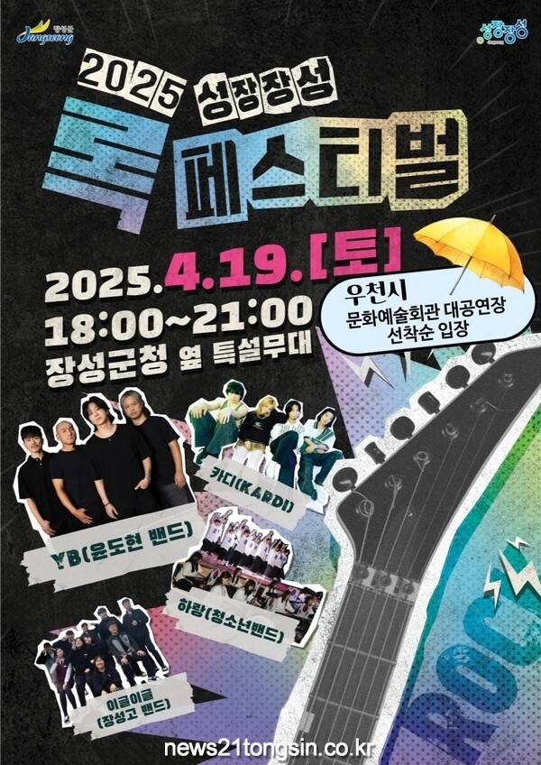 한편, 장성군은 공연 당일 비가 내릴 경우 장성문화예술회관 대공연장에서 선착순 무료 입장으로 페스티벌을 진행할 예정이다. 관련 문의는 장성군 문화교육과 문화예술팀(061-390-8476)으로 하면 된다.