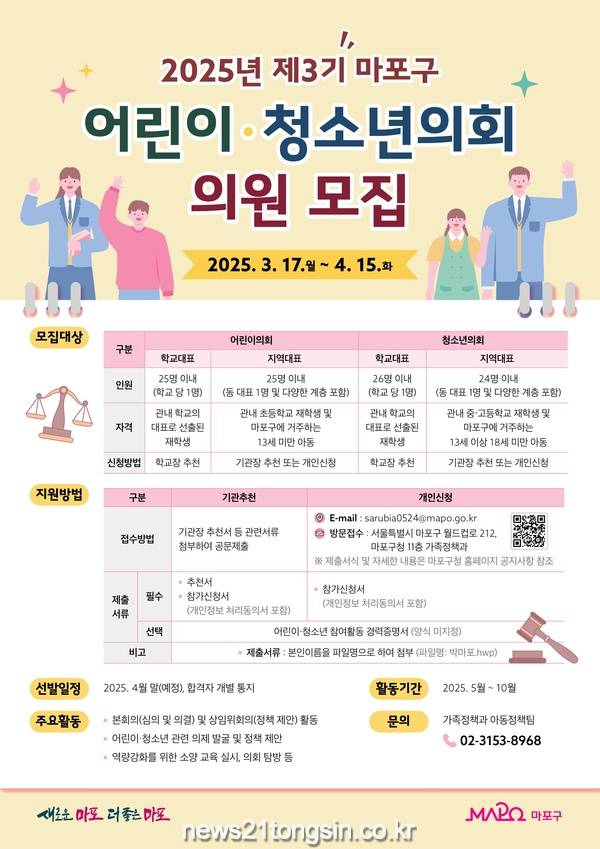 마포구(구청장 박강수)는 ‘제3기 마포구 어린이·청소년의회’에서 활동할 어린이·청소년 의원을 4월 15일까지 모집한다.