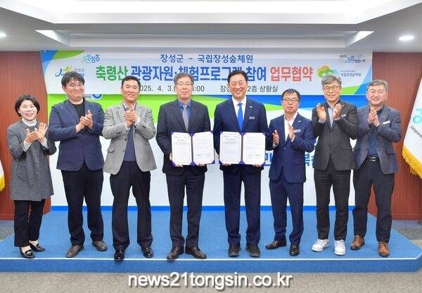 장성군과 국립장성숲체원이 축령산 체험관광 활성화를 위해 힘을 모으기로 했다. 군과 숲체원은 최근 군청 상황실에서 ‘축령산 관광자원 체험 프로그램 업무협약’을 체결했다. 김한종 장성군수, 정종근 국립장성숲체원장을 비롯한 관계자 10여 명이 참석했다.