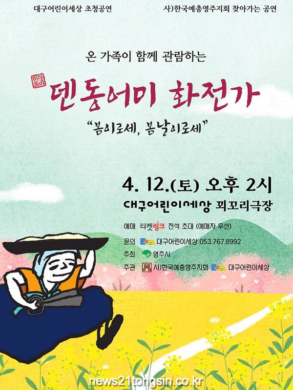 대구어린이세상에서 준비한 봄맞이 첫 무대는 ‘덴동어미 화전가’라는 마당놀이 공연으로 4월 12일(토) 오후 2시에 전석 무료 초대로 진행된다.
