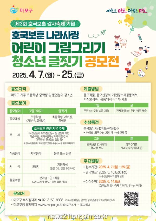 마포구(구청장 박강수)는 ‘제3회 호국보훈 감사축제’를 맞아 ‘호국보훈·나라사랑 어린이 그림그리기·청소년 글짓기 공모전’을 개최한다.