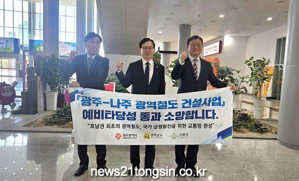 ▲ 광주·전남·나주 부단체장, ‘광역철도사업 예타조사 통과’ 기원 현수막 퍼포먼스 (사진=나주시)광주광역시와 전라남도, 나주시 부단체장들이 ‘광주-나주 광역철도사업’ 예비 타당성 조사 통과를 한 목소리로 촉구했다.
