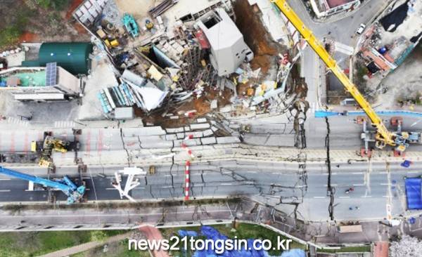 경기 광명시 신안산선 지하터널 공사현장 붕괴 사고 현장에서 실종된 50대 근로자를 찾기 위한 하부 수색작업이 추가 붕괴 우려 등으로 일시 중단됐다.