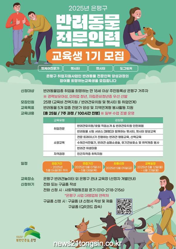 은평구 관계자는 “이번 교육을 통해 반려동물 산업 분야에 관심 있는 구민에게 새로운 기회를 제공할 것이다”며 “체계적 교육 과정으로 양성된 반려동물 전문가들이 지역경제 활성화는 물론 성숙한 반려 문화 조성을 위한 토대를 마련하겠다”고 말했다.