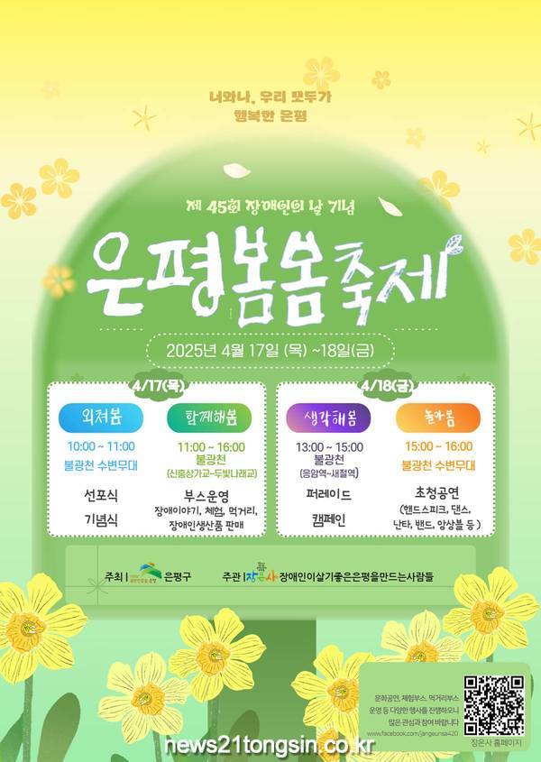 서울 은평구(구청장 김미경)는 제45회 장애인의 날 기념해 오는 17일부터 18일까지 불광천에서 장애인과 비장애인 함께 참여하는 소통과 화합의 장인 ‘은평봄봄축제‘를 개최한다고 밝혔다.